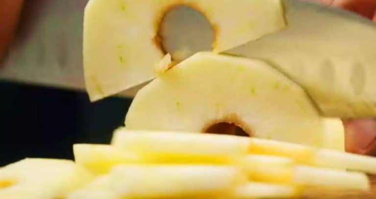 Яблука очищаємо від шкірки і нарізаємо тонкими часточками (слайсами). Додаємо їх в тісто і перемішуємо руками, так щоб всі часточки вкрилися тістом.