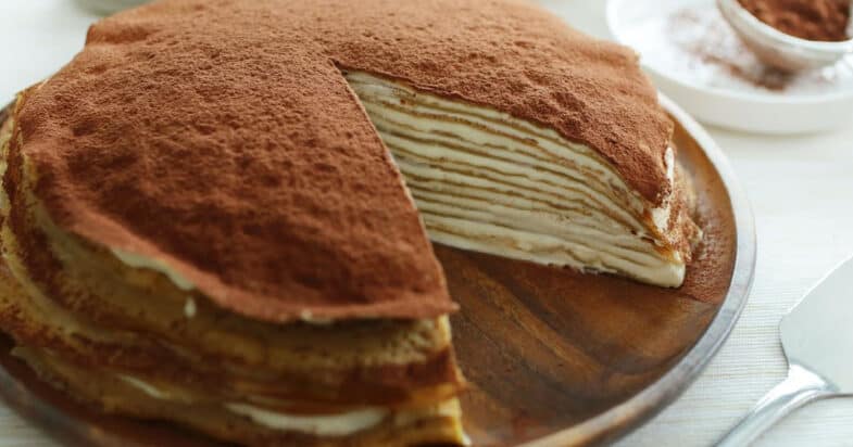 Візьміть форму з роз’ємним кільцем (діаметр 20 см). Покладіть всередину перший млинець, змастіть його кавою, а потім покрийте тоненьким шаром крему. Так чинимо з усіма млинцями, поки вони не закінчаться. Верхній млинець теж просочуємо кавою і покриваємо кремом. Бока просто змастіть кремом. Зверху посипаємо какао.