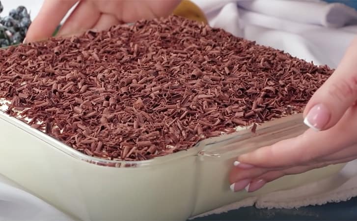 Суміш, що вийшла, переливаємо у форму для запікання, зверху посипаємо її шоколадною крихтою і ставимо в холодильник на півгодини. Залишиться лише розкласти десерт на порційні тарілочки.