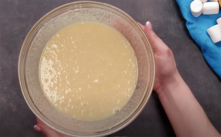 Розбиваємо в миску 3 яйця, додаємо 200 г цукру, 100 г крохмалю, 10 г ванільного цукру, 100 мл молока, все перемішуємо вінчиком. Суміш, що вийшла, вливаємо в каструлю з молоком, ставимо її на плиту.