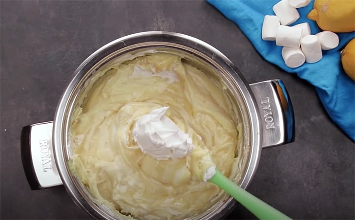 Тримаємо на середньому вогні до загусання постійно помішуючи, потім знімаємо та закриваємо харчовою плівкою, нехай остигає. Після остигання збиваємо крем міксером. В окрему миску наливаємо рідкі вершки, додаємо 100 г цукрової пудри і також збиваємо міксером, а потім перекладаємо збиті вершки до крему.