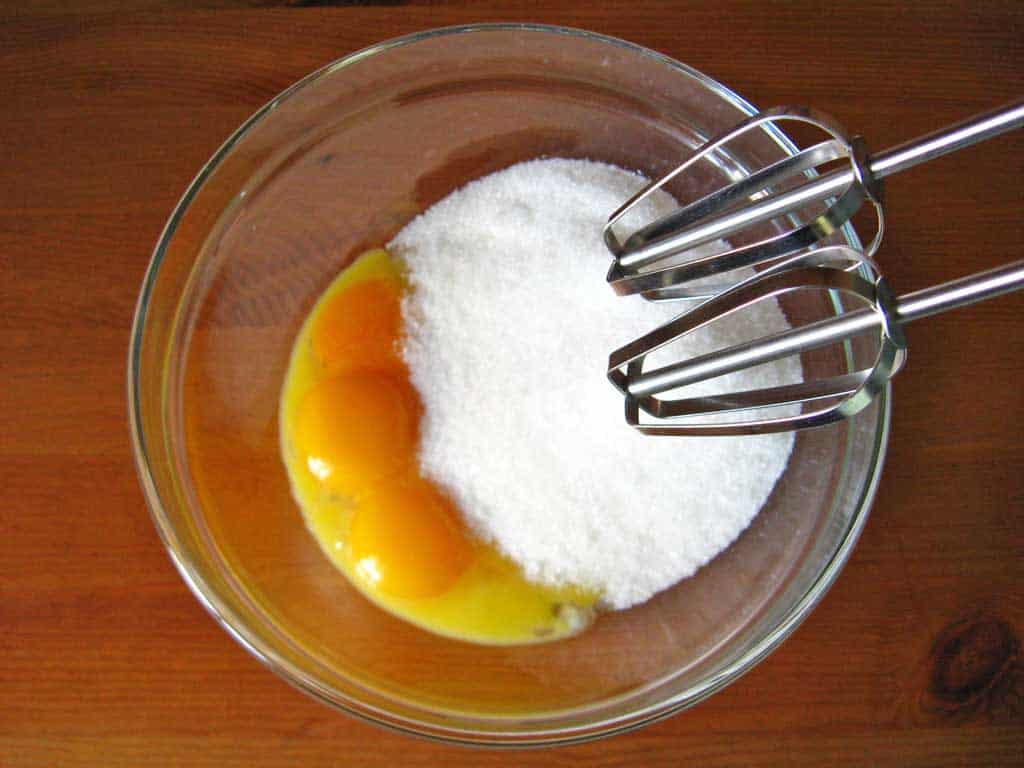 У миску розбиваємо охолоджені яйця і починаємо збивати на максимальній швидкості міксером. Поступово вводимо цукор. Маса повинна вийти білою та злегка пишною.