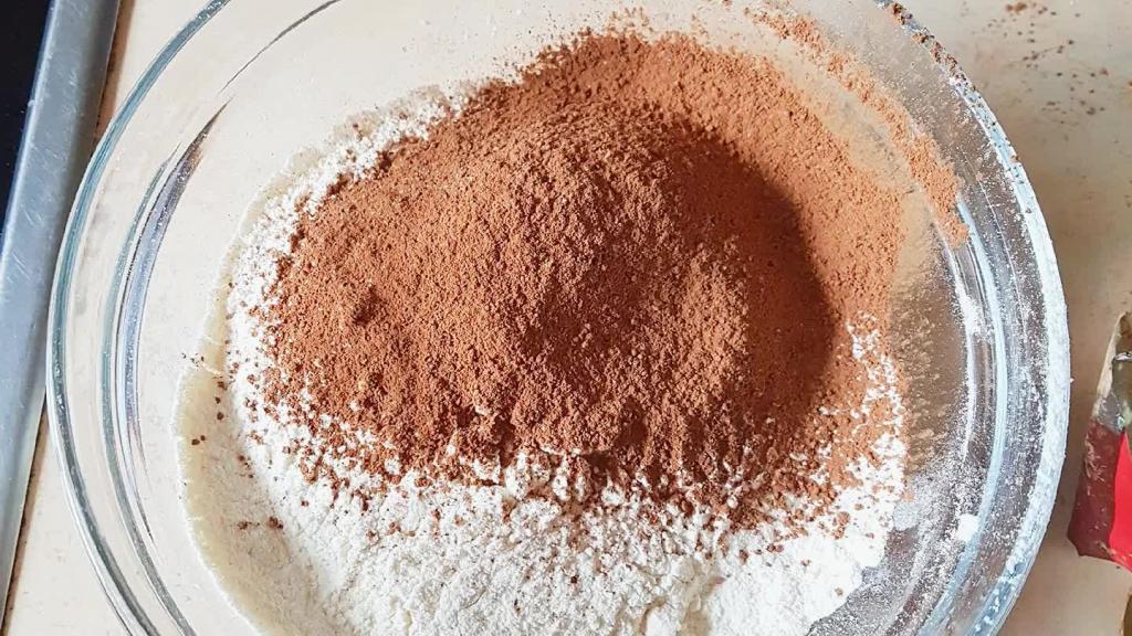 Окремо просіюємо борошно з какао. Невеликими порціями починаємо вмішувати в яєчну суміш. При цьому користуємося лопаткою. Тісто має вийти пишним та однорідним.