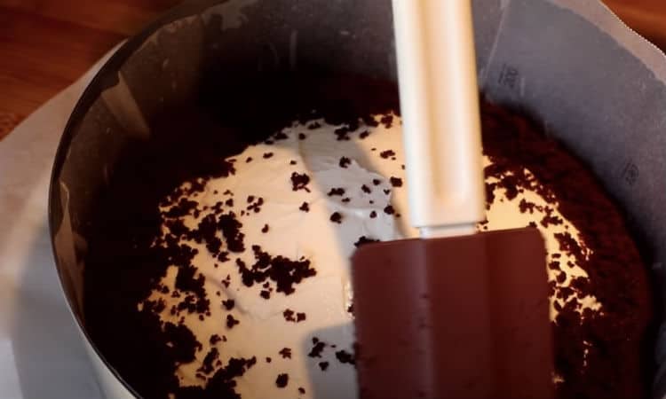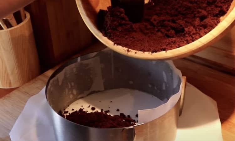 На застелену пергаментним папером тарілку ставимо форму для формування пирогів. Також простеліть краї форми папером, щоб торт до них не прилипав. Пересипаємо частину крихти від шоколадного печива у форму – це основа торта. Утрамбуйте її більш щільно і на 10 хвилин поставте заготовку в морозилку.