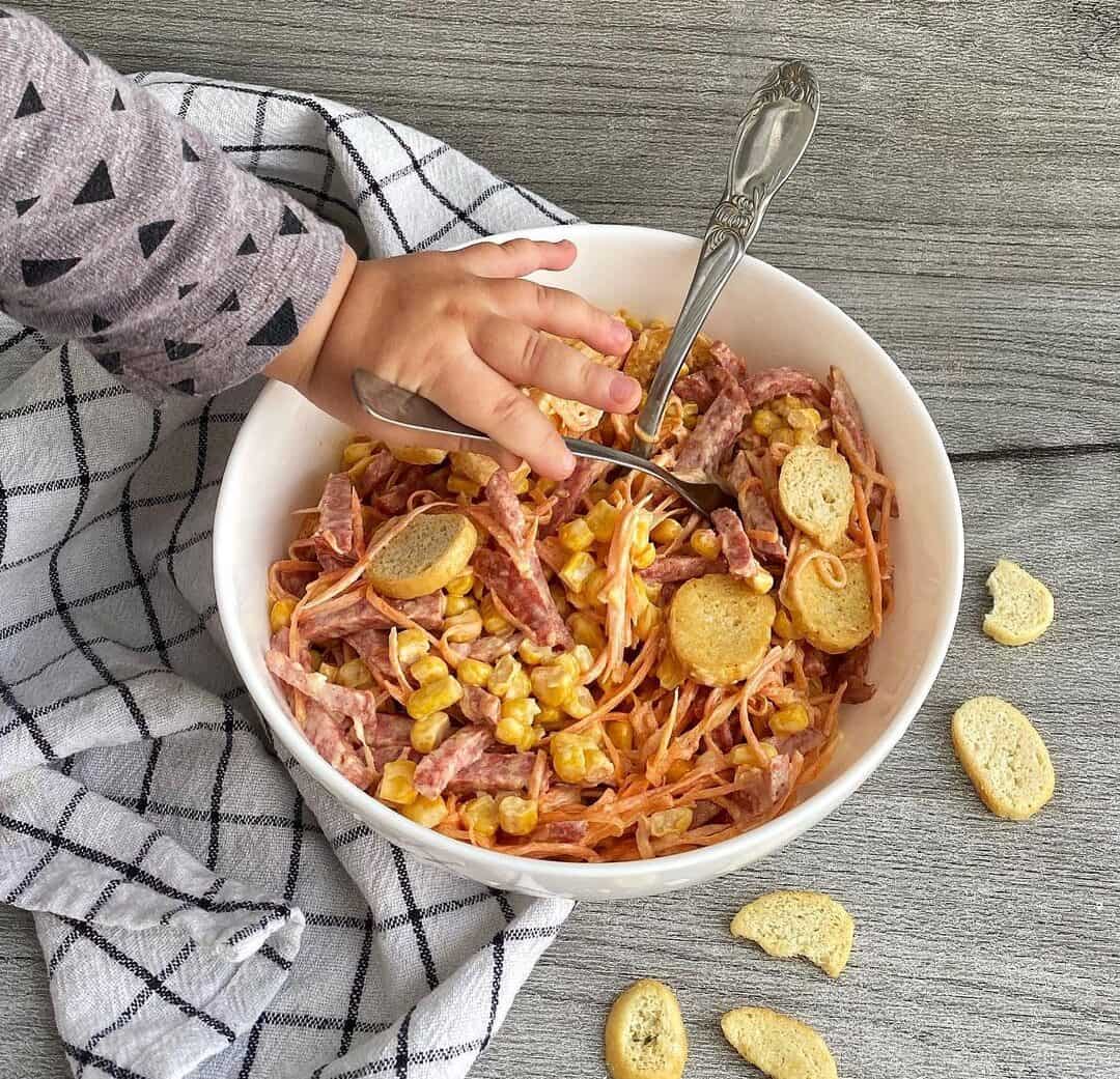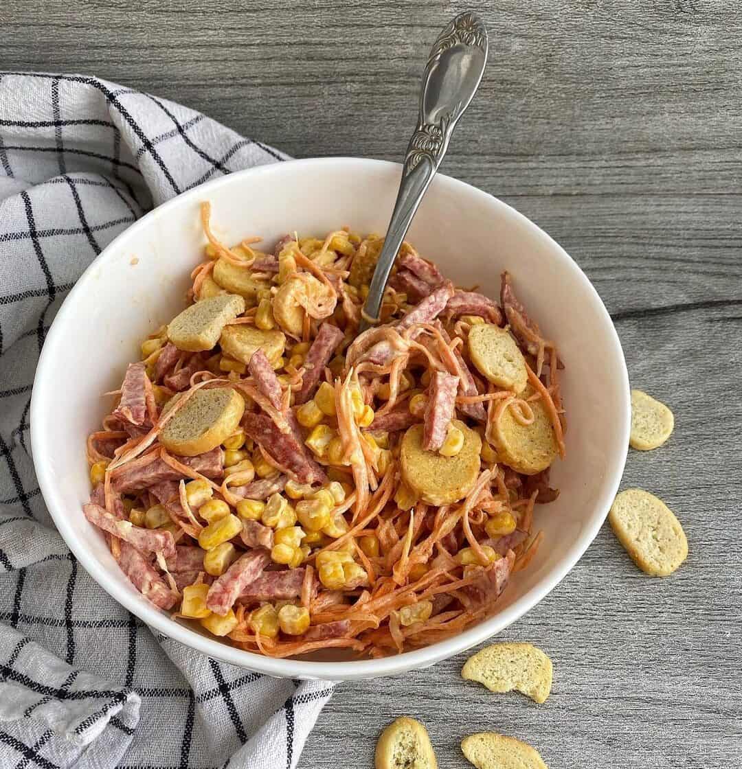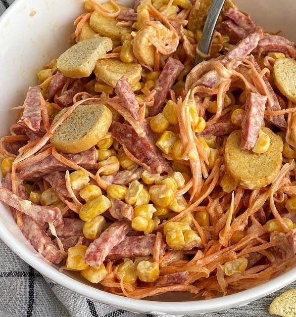 З’єднайте ковбасу, кукурудзу і корейську моркву.