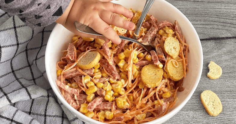 З’єднайте ковбасу, кукурудзу і корейську моркву.