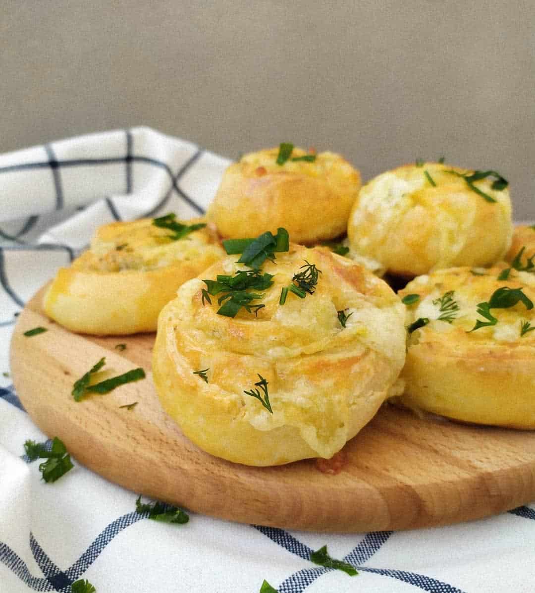Тісто розкачати в пласт, змастити розтопленим вершковим маслом, посипати натертим сиром, орегано. Скрутити рулет. Порізати на шматочки 3 см. Викласти на застелене пергаментом деко. Змастити жовтком + 1 ст л молока.