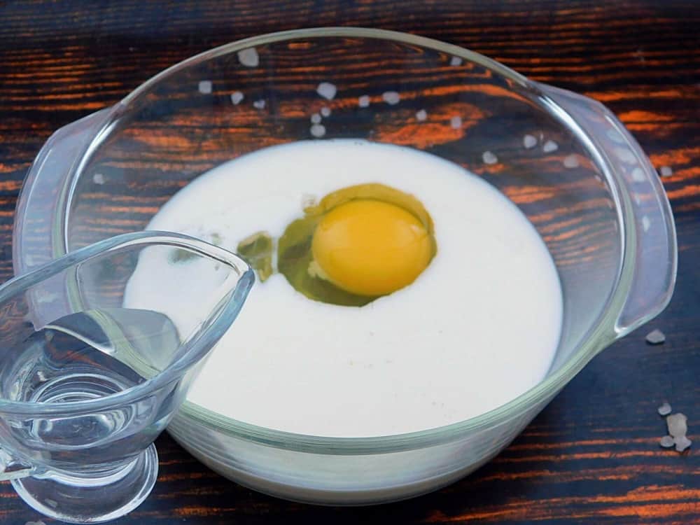 У миску вилити молоко, розбити одне яйце, а від іншого в тісто піде лише білок, жовток залишити для змащування. Всипати сіль. Влити столовий оцет, перемішати.