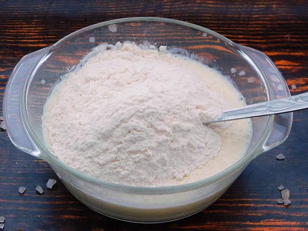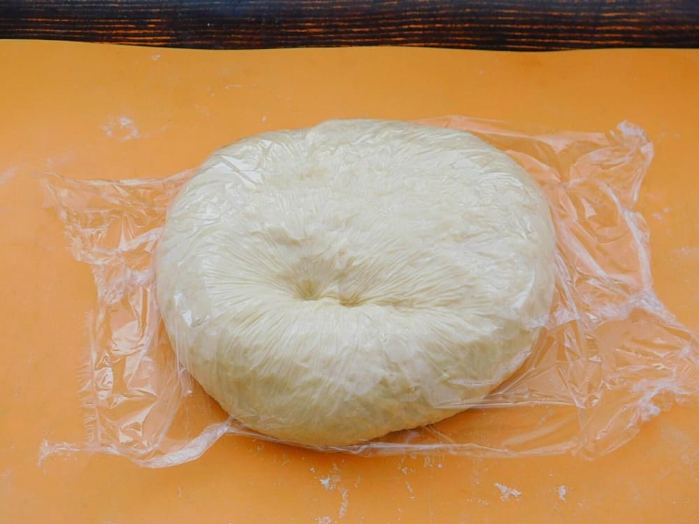 Спочатку діяти ложкою чи вилкою, а потім продовжити руками. Вимішувати інтенсивно щонайменше 5 хвилин. Накрити плівкою і залишити на півгодини для розвитку клейковини.