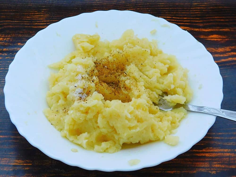 За цей час зробити начинку. Картоплю зварити до готовності, розім’яти виделкою, додати сіль та приправу.