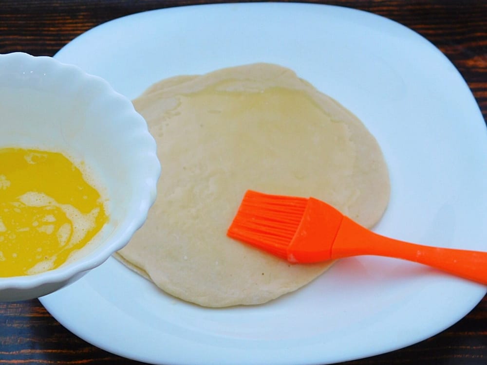 Тісто поділити на 12 колобків. Кожен розкачати в якомога тонший коржик. Вершкове маслорозтопити і за допомогою кисті змастити кружок з тесту. Так викласти 4 коржики один на один, промазуючи їх олією.