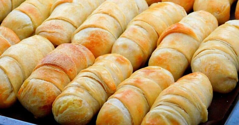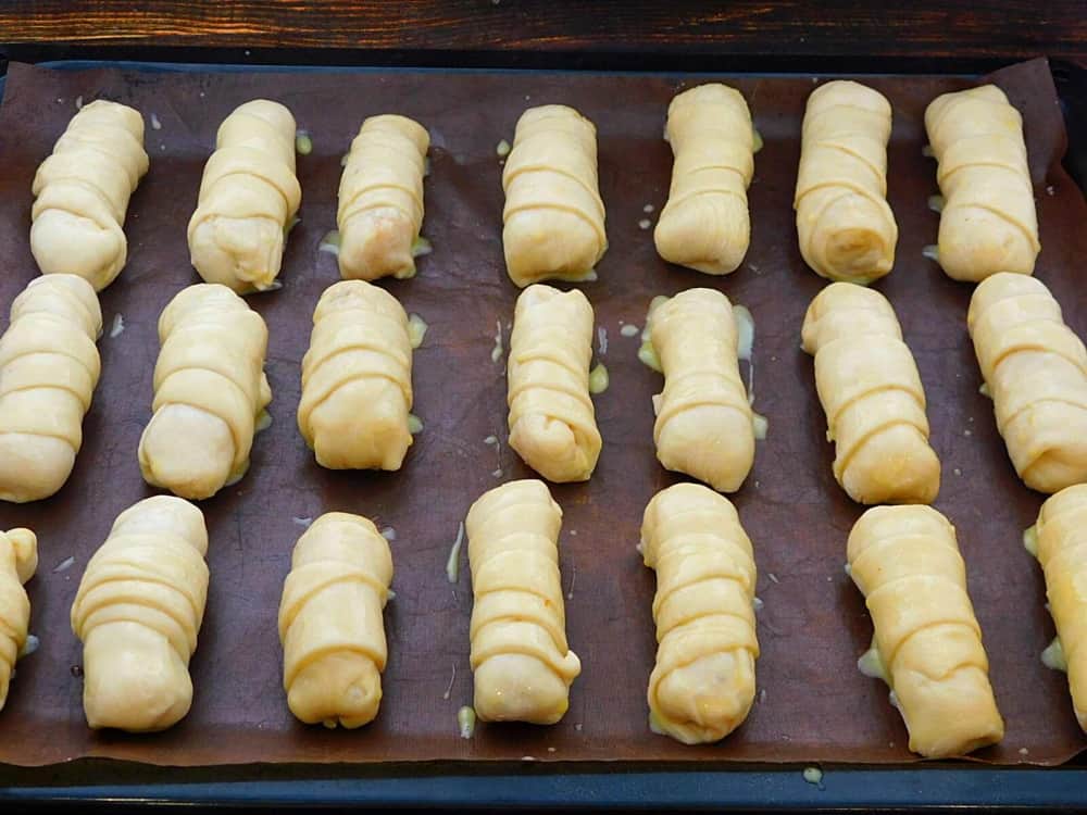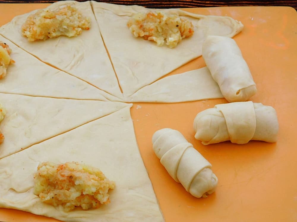 Руками розтягнути на дошці. Нарізати на 8-10 трикутних сегментів. В основу кожного помістити столову ложку картопляної начинки. Почати згортати, підігнути краї, щоб начинка не вивалювалася, а потім скручувати в трубочку, постійно тримаючи тісто в натягу. Воно чудово розтягується, тому вдасться зробити багато обертів.