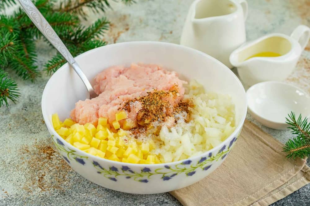 Тим часом приготуйте начинку. М’ясо помийте, зачистіть від жиру та плівочок, поріжте на невеликі шматочки. Подрібніть м’ясо на однорідний фарш за допомогою м’ясорубки або блендера. Картоплю помийте, очистіть від шкірки, наріжте дрібним кубиком. Цибулю очистіть від лушпиння, поріжте дрібним кубиком. Змішайте фарш з картоплею та цибулею, додайте сіль та спеції за смаком. Перемішайте начинку до однорідної суміші.