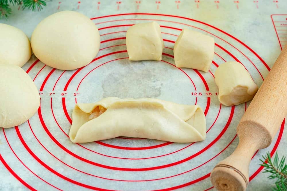 Готове тісто розділіть на 16 частин однакового розміру. Розкотіть кожну заготовку в круглий пласт завтовшки 2-3 мм. По центру викладіть столову ложку начинки. Скріпіть виріб по центру, залишаючи краї вільними.