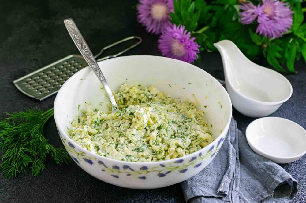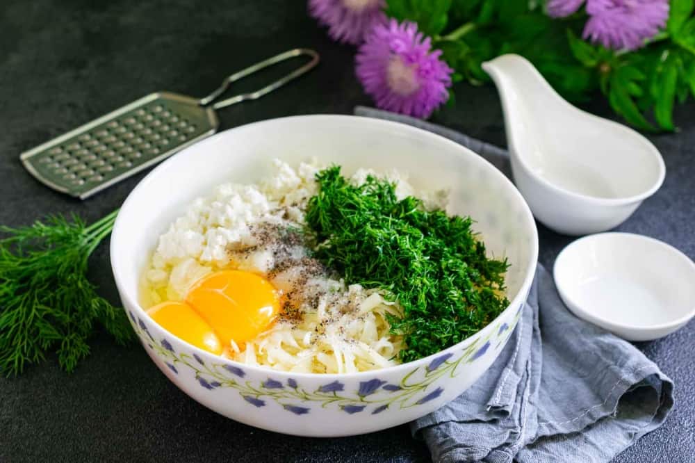 Сир моцареллу натріть на великій тертці. Додайте до тертого сиру творог середньої жирності. Вбийте в отриману масу 2 курячі яйця. Додайте дрібно порізаний свіжий кріп, сіль і чорний мелений перець за смаком.