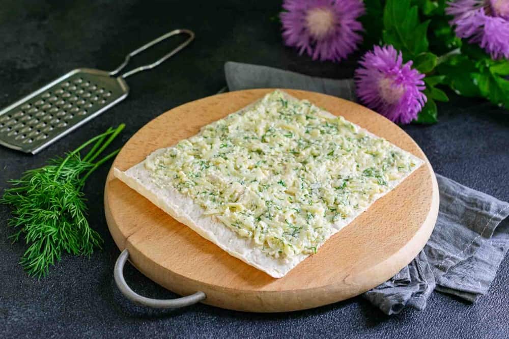 Лаваш розріжте на прямокутні заготовки зі сторонами 10×15 см. На кожен шматочок лаваша викладіть столову ложку начинки. Розрівняйте її по всій поверхні лаваша, не доходячи до краю 1 см.