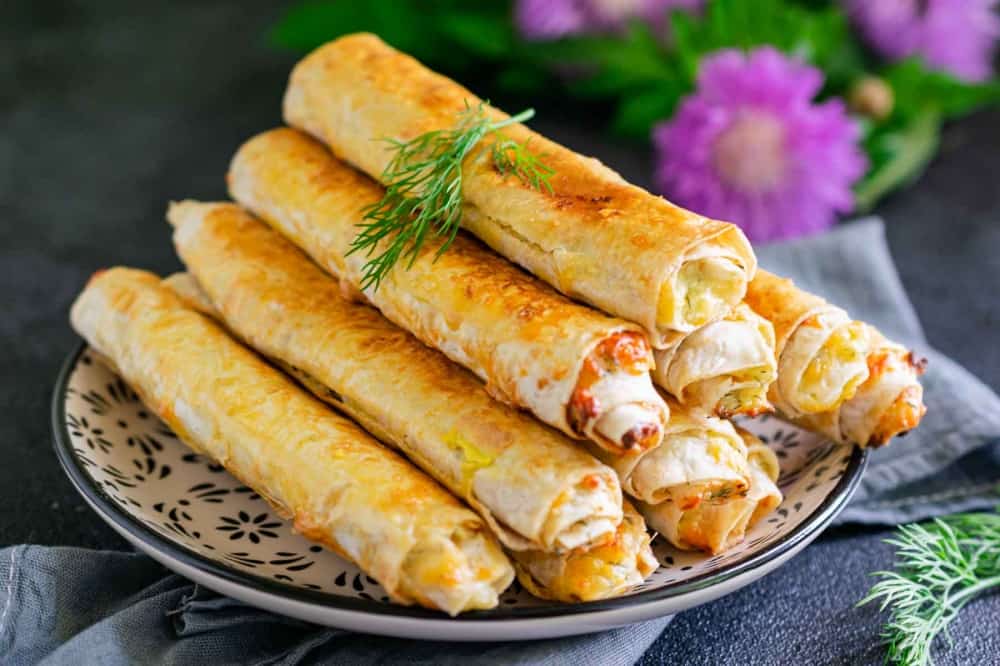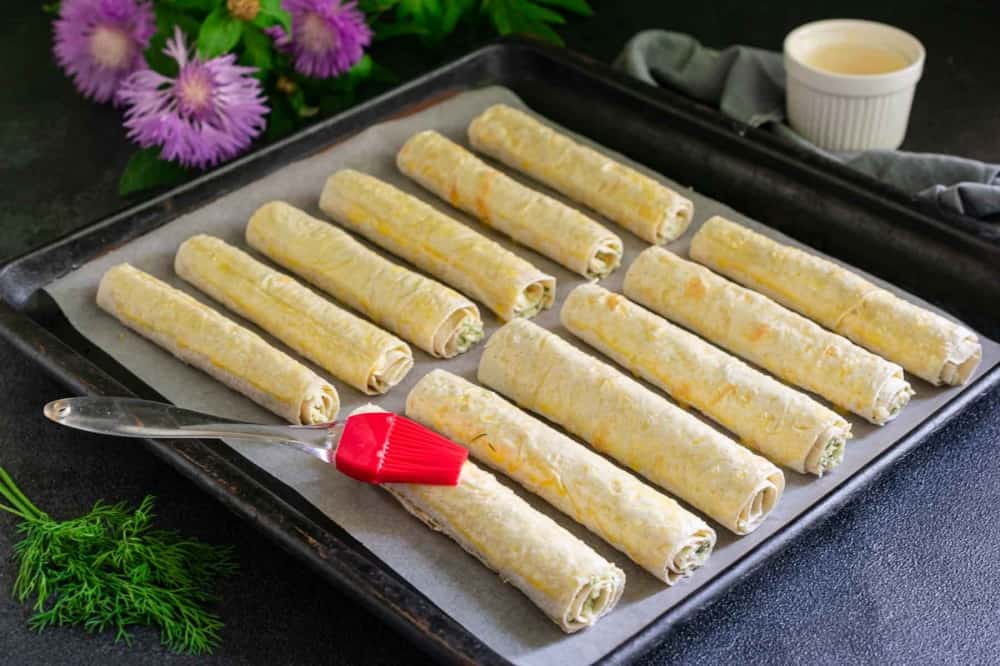 Відправте трубочки з лаваша в попередньо розігріту до 180 градусів духовку на 15 хвилин, щоб вони підрум’янилися, а начинка всередині пропеклася. Також пиріжки можна обсмажити на вершковому маслі або олії на середньому вогні до золотистого відтінку з усіх боків.