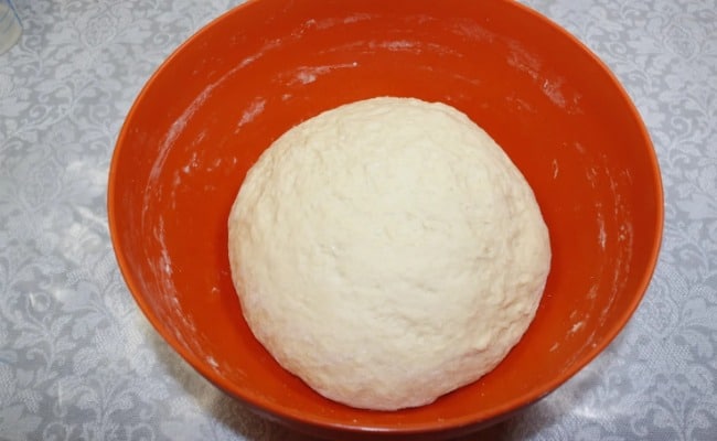 У глибоку миску відправляю два жовтки, розтоплене (не гаряче) вершкове масло (можна використовувати олію), решту теплого молока, сіль за смаком. Добре все перемішую. Додаю дріжджі (опару), перемішую і, поступово просіюючи борошно, замішую м’яке тісто, яке липне до рук.