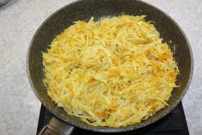 Тісто накриваю рушником і залишаю в теплому місці для підйому. Далі готую начинку: спершу обсмажую на невеликій кількості соняшникової олії цибулю з морквою, потім додаю до них нарізану капусту. Перемішую і обсмажую всі овочі ще кілька хвилин до готовності.