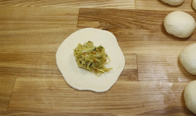 В кінці додаю сіль, перець за смаком, зелену цибулю з кропом за бажанням, перемішую і залишаю начинку до повного охолодження. Тісто, що підійшло обминаю і ділю на рівні частини-кульки. Потім кожну кульку розкочують і викладаю в середину начинку.