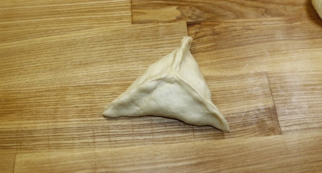 Формую пиріжки трикутної форми, згинаючи краї тіста і защипуючи їх з трьох сторін.