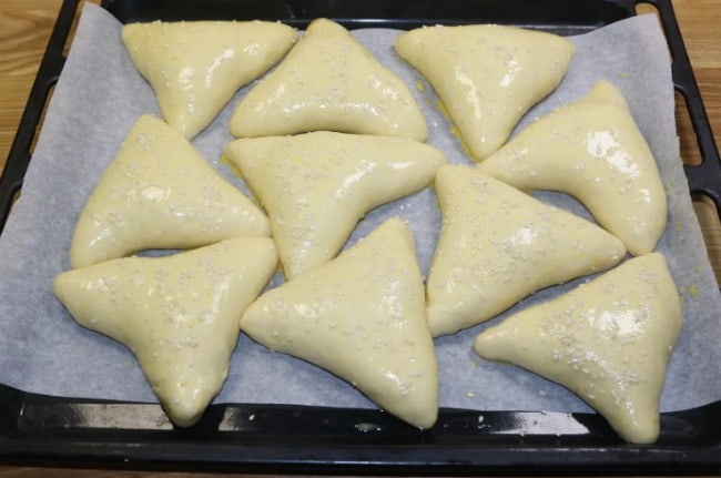 Пиріжки викладаю швом вниз на підготовлений лист, накриваю їх і даю постояти 10-15 хвилин. Потім пиріжки змащую яйцем, а зверху посипаю кунжутом.