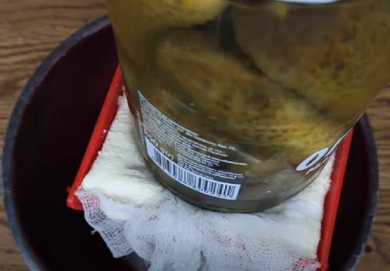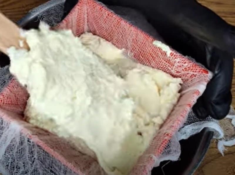 Накривай верх пасочки марлею. Зверху на пасху потрібно розмістити будь-яку поверхню (наприклад, тарілку) та грузик (я використовую баночку з огірками). Під гнітом паска повинна бути в холодильнику більше 10 годин. Не забувай періодично зливати сироватку.