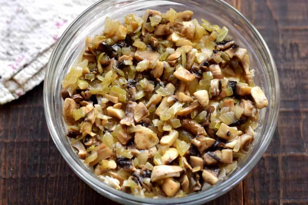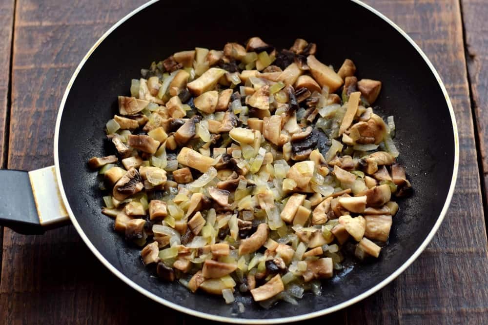 Головку цибулі очистіть, наріжте дрібним кубиком, обсмажте в маслі до м’якості та легкої золотистості. Гриби ретельно вимийте, наріжте на шматки середнього розміру, закиньте до цибулі. Суміш смажте 5-7 хвилин до повного випаровування грибного соку, наприкінці посоліть.