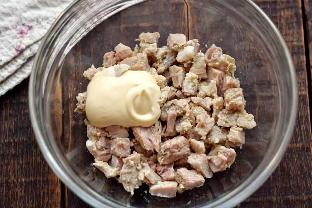 М’ясо заздалегідь відваріть у підсоленій воді до готовності. Повністю остудіть його та наріжте кубиками середнього розміру. Помістіть їх у глибоку ємність, додайте майонез, перемішайте, потім розрівняйте ложкою.