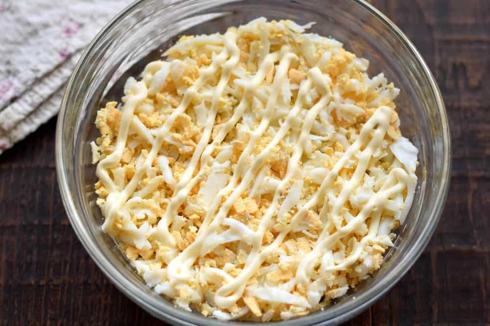 Яйця зваріть круто, очистіть, білок і жовток натріть на тертці, викладіть наступним шаром, покрийте майонезом, присипте сіллю і меленим чорним перцем.