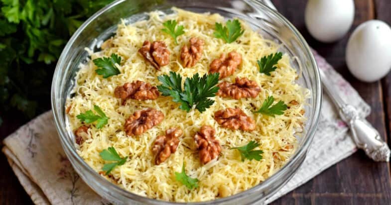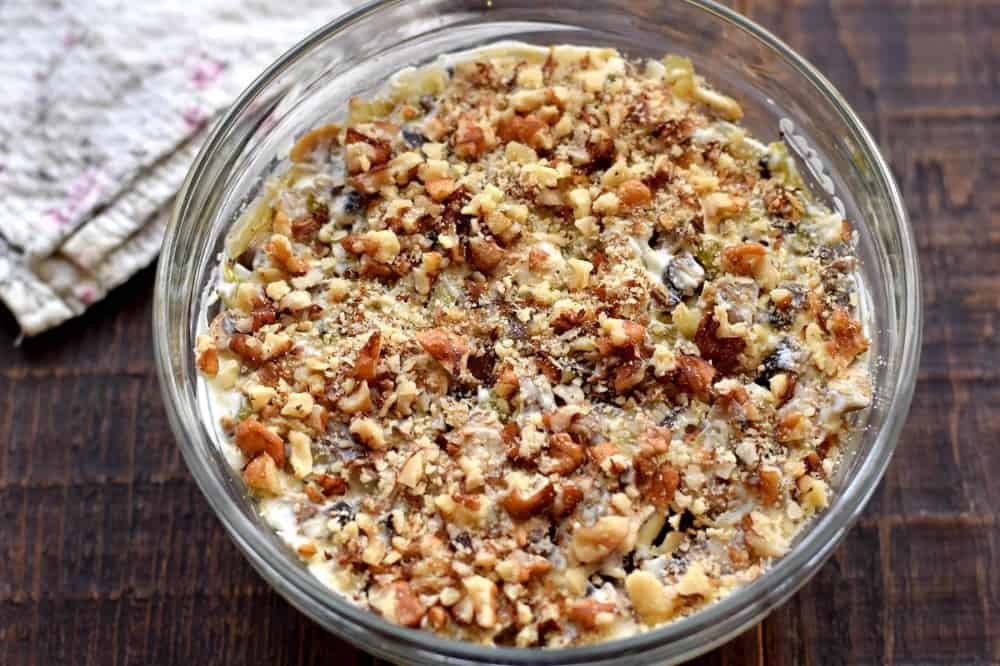 Перед подачею прикрасьте салат волоськими горіхами та зеленню. Смачного!