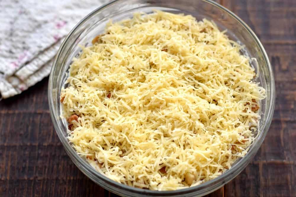 Сир натріть на дрібну крихту, зі стружки сформуйте верхній шар.