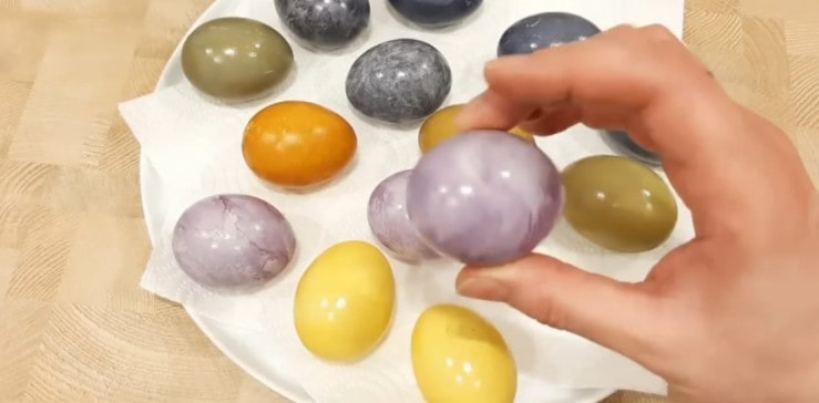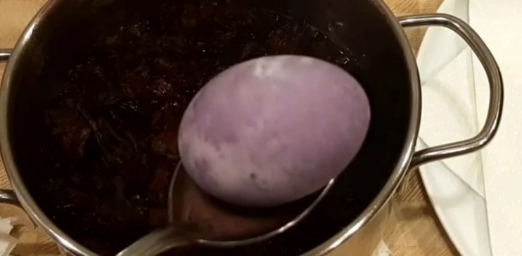 Поки яйце плаває в розчині, воно блідо-рожевого кольору. Дістаю яйця, і в міру випаровування вологи відтінок пофарбованого яйця стає красивого бузкового кольору. Акуратно промочую яйця серветкою.