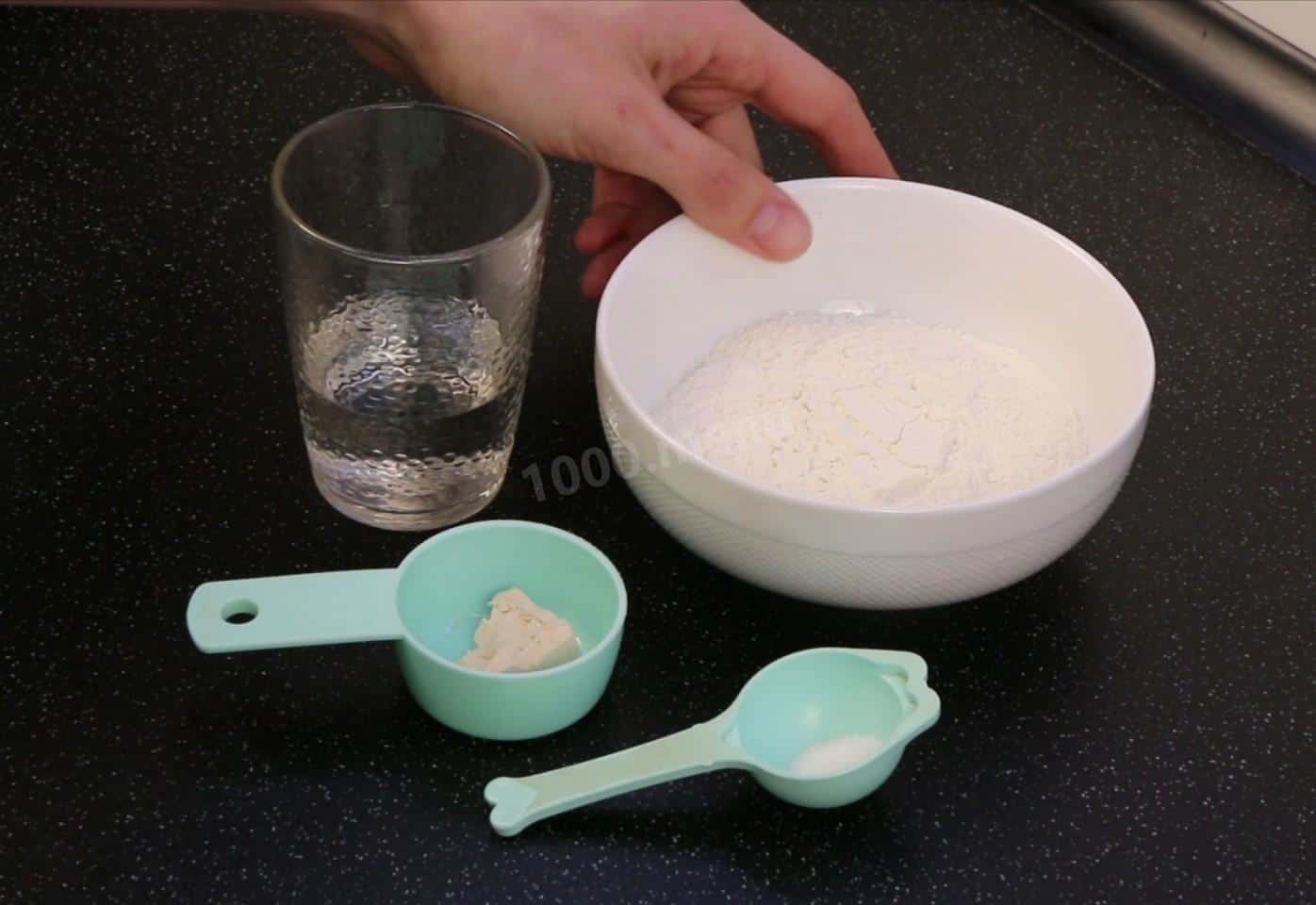 У воді розчиняю дріжджі. Борошно з’єдную з сіллю. Все змішую та замішую тісто. Кладу в тарілку, загортаю плівкою і залишаю при кімн. температурі на 3 год., щоб маса добре збільшилася. Обминаю (якщо липне, змастити руки і робочу поверхню олією), складаю втричі (листом), округляю, знову добре загортаю харчовою плівкою і прибираю в холодильник на 10-12 год.