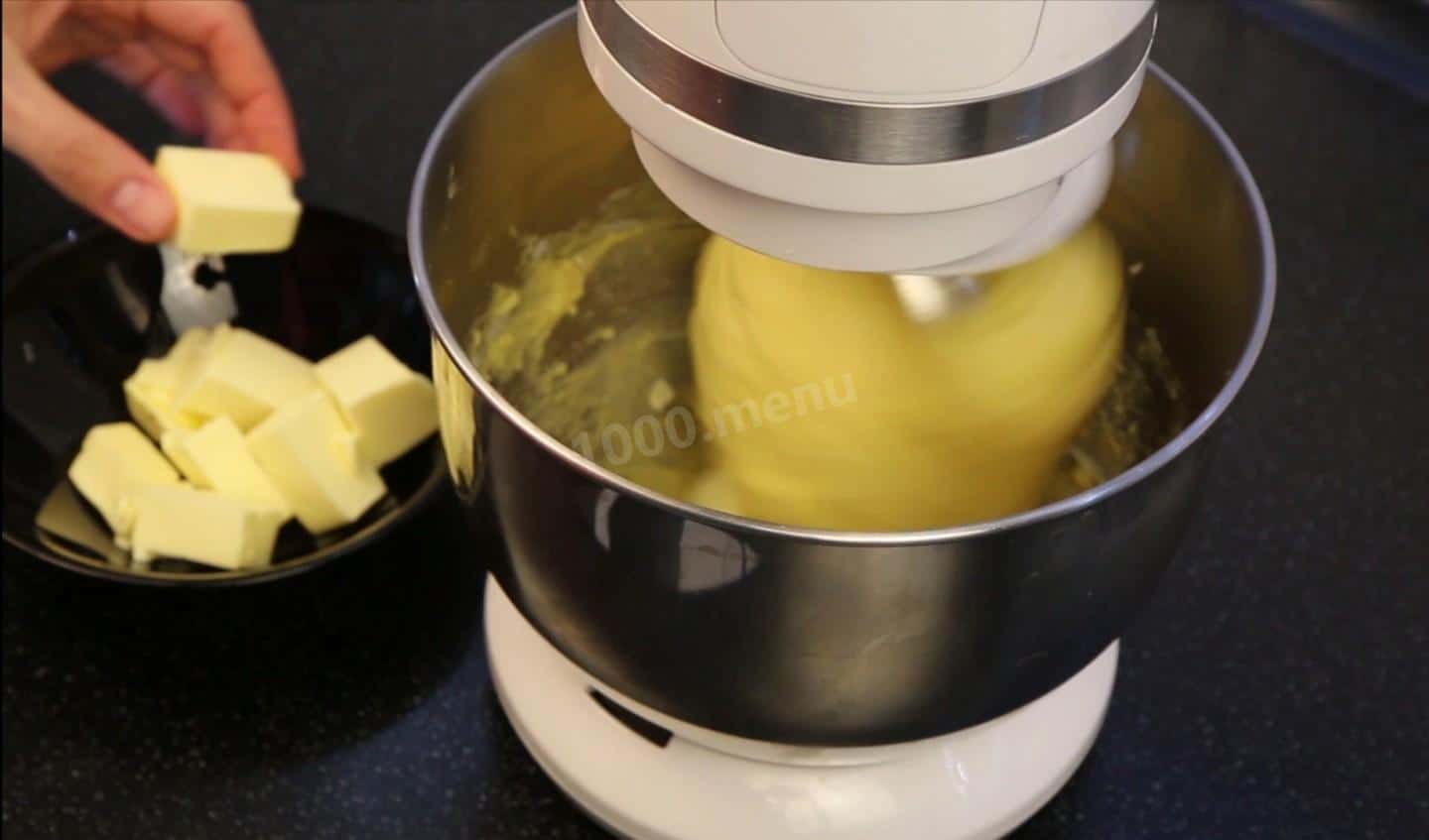 Додаю масло невеликими кубиками та продовжую вимішувати тісто. За часом це може бути у всіх по-різному.
