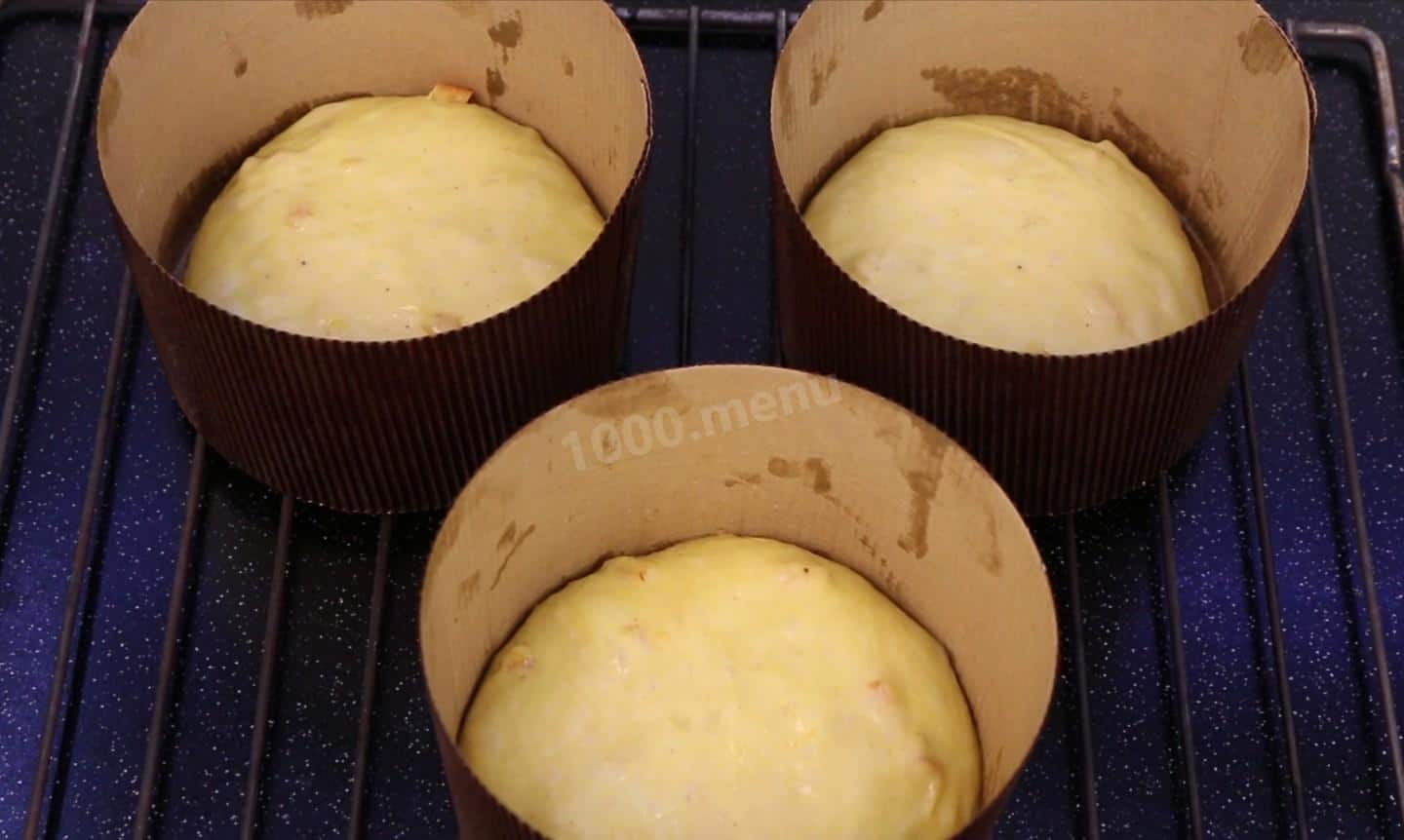 Поділяю тісто на 3 рівні частини, по 410г кожна. Округлюю, як би натягуючи верхівку і заповнюю форми на 1/3. Накриваю харчовою плівкою та залишаю при кімнатній температурі на 2,5-3 години.