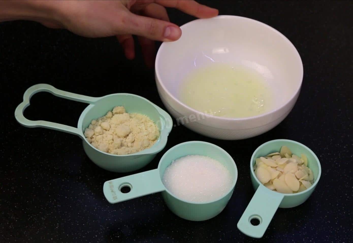 Коли розстойка тіста добігатиме кінця, можна приготувати мигдальну скоринку. Для неї знадобиться: Яєчний білок. Мигдалеве борошно. Цукор. Мигдальні пелюстки.