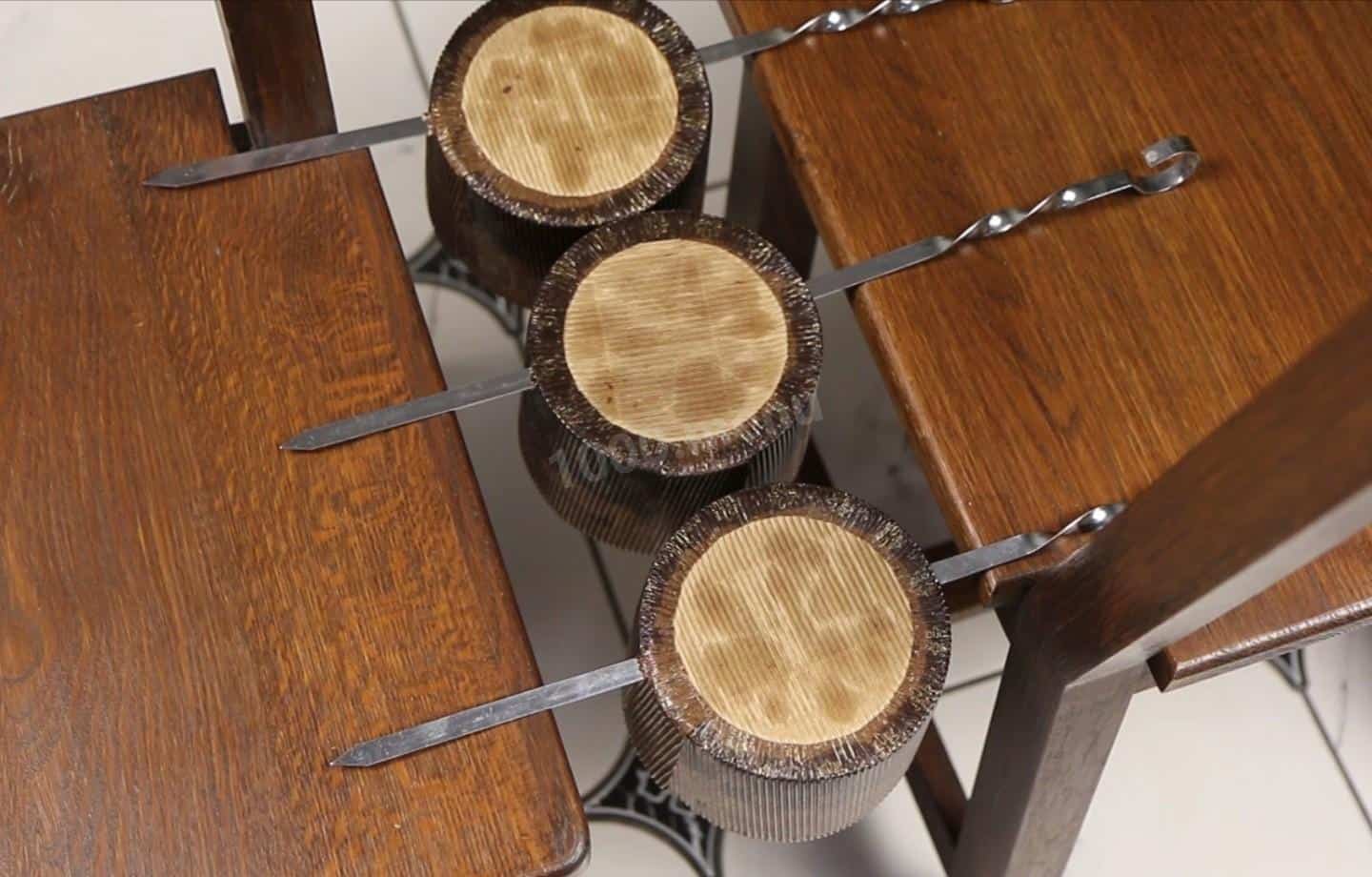 Ось такі рум’яні, гарні паски вийшли. Але не розслабляємось, вони дуже ніжні і тісто може осісти під власною вагою. Охолодити їх потрібно догори дном. Проколюю шпажкою (шампурами:)) перевертаю і закріплюю на чомусь придатному.