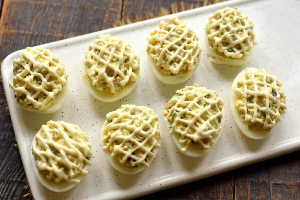 Наповніть яйця приготованою начинкою, формуючи невеликі гірки. Зверху на начинці зробіть тонку сітку з майонезу.