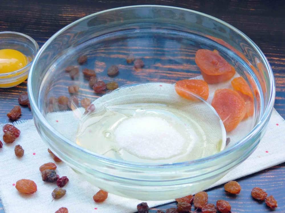 Підготувати все потрібне. Сухофрукти, тут це родзинки та курага, промити і обсушити, курагу нарізати на кубики.