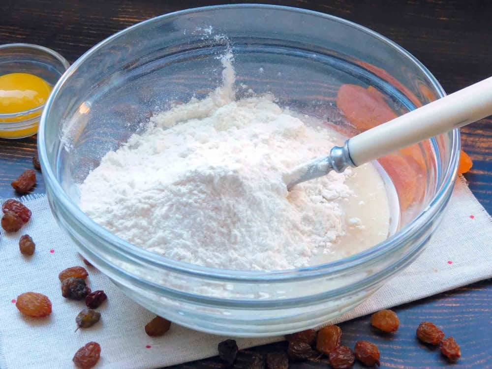 Перемішати. Свіжі дріжджі роздрібнити руками. Молоко попередньо підігріти і влити до решти продуктів. Якщо використовувати холодне молоко, тісто довше підходитиме. Змішати, щоб дріжджі розчинилися.