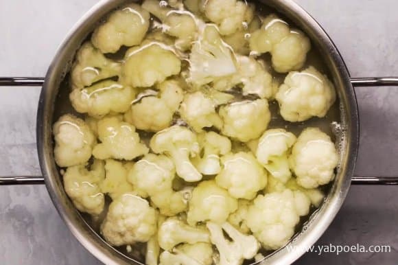 Цвітну капусту розріжте на суцвіття невеликих розмірів. Складіть усі суцвіття в киплячу воду з 1 ч. л. солі. Варіть 4 хвилини, потім злийте воду, капусту остудіть.