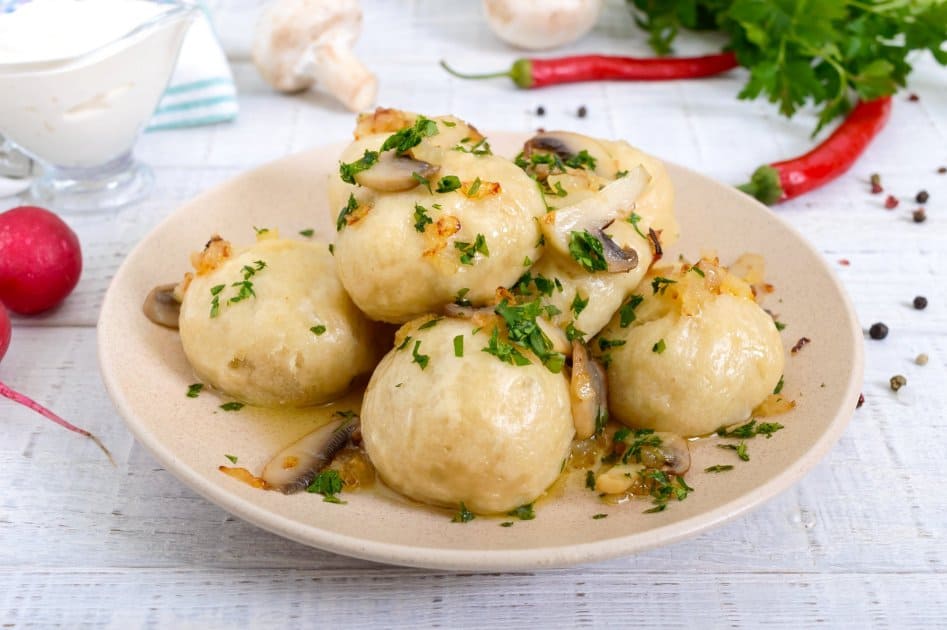 Смакувати готові галушки можна самостійно, як гарнір чи замість хліба — у складі борщу або супу. Вони надзвичайно апетитні та ситні, адже, окрім грибів чи м’яса, їх заправляють ще й сметанкою, а зверху посипають тертим сиром і зеленню.