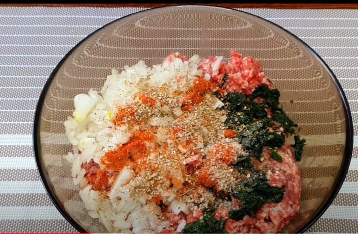 У фарш додаємо цибулю кубиками, зелень, сіль та спеції, добре вимішуємо до однорідності. За смаком та бажанням, додавайте часник, можна трохи гострого червоного перцю.