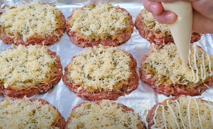 Формуємо круглі котлетки, викладаємо у форму та робимо з них м’ясні коржики.