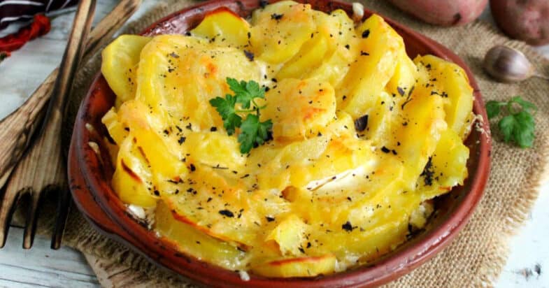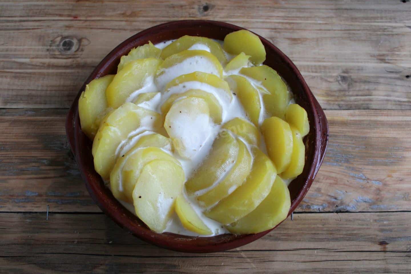 Картоплю помийте, очистіть і наріжте на тонкі пластини. Якщо картопля молода, то її достатньо помити, а нарізати картоплю можна разом зі шкіркою. Картоплю викладіть шарами або гармошкою у форму, змащену вершковим маслом.