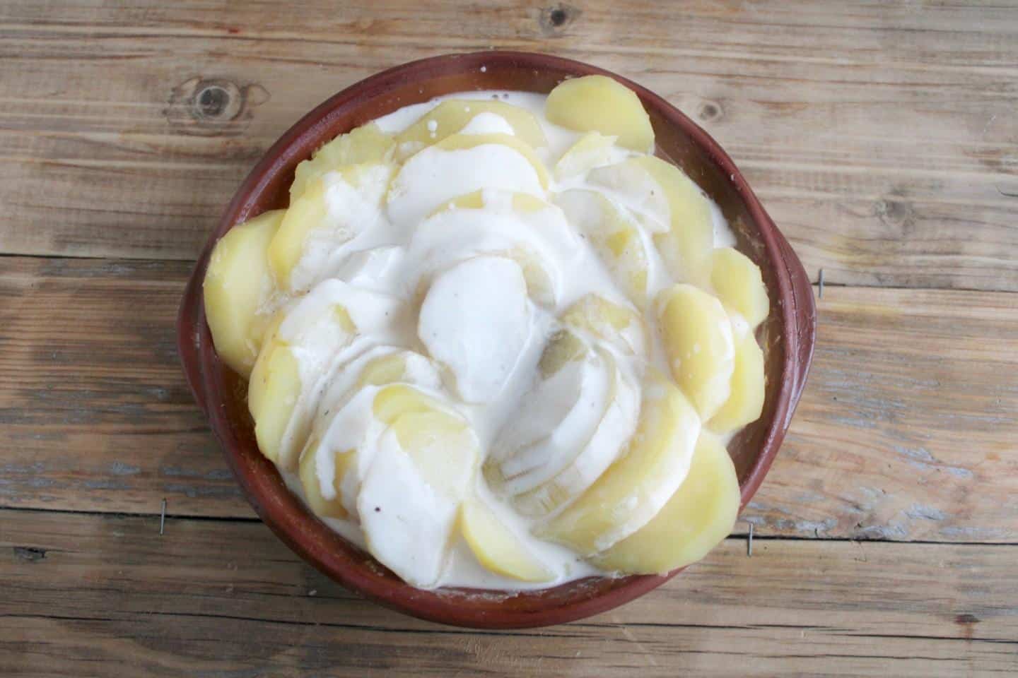 Залийте картоплю сметанним соусом у формі для запікання. Духовку розігрійте до 180 градусів. Форму з картоплею можна накрити фольгою, щоб картопля швидше пропеклася, але не пересохла. Відправте форму з картоплею в духовку.