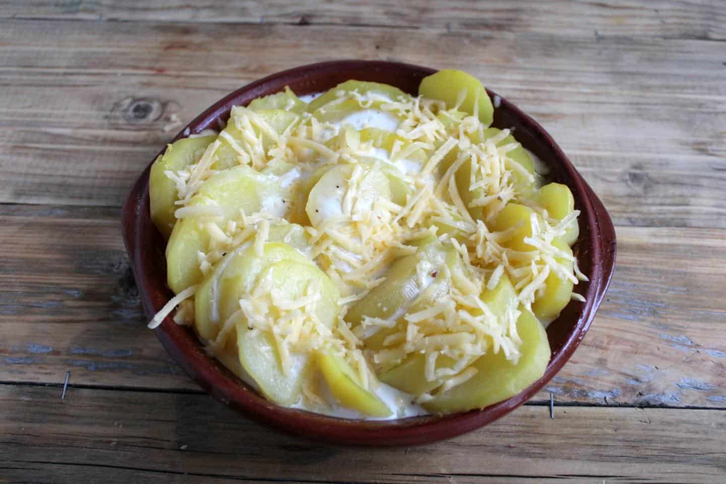 Картоплю присипте тертим сиром. Поставте картоплю в духовку ще на 10 хвилин. Запікайте картоплю до утворення рум’яної скоринки.