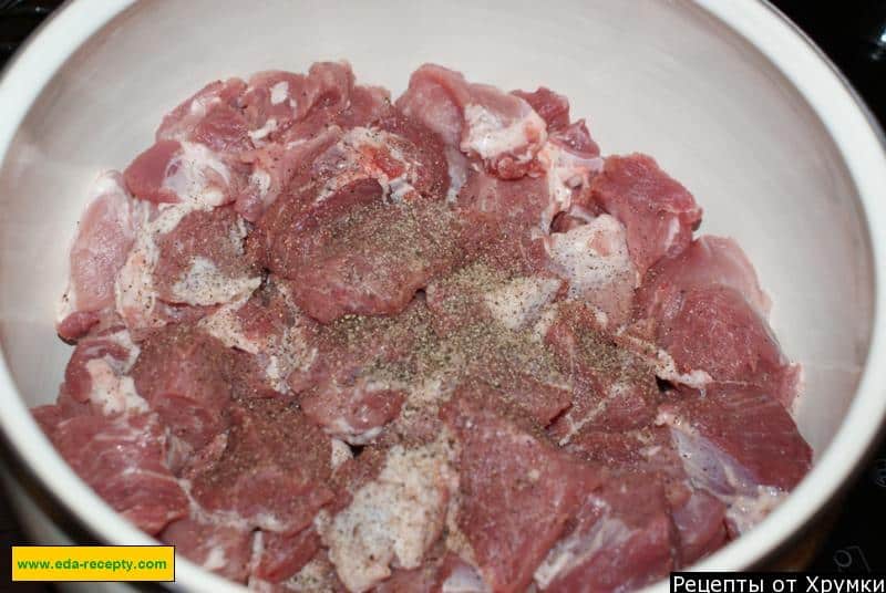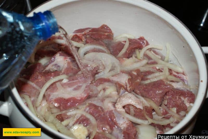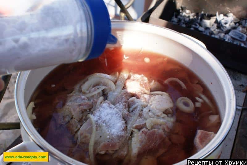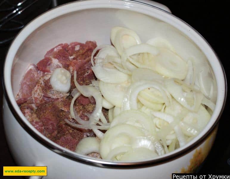 Візьміть глибоку емальовану каструлю, викладіть у неї шматочки м’яса та цибулі. Якось я використовувала для маринування глиняний посуд – також непогана річ.