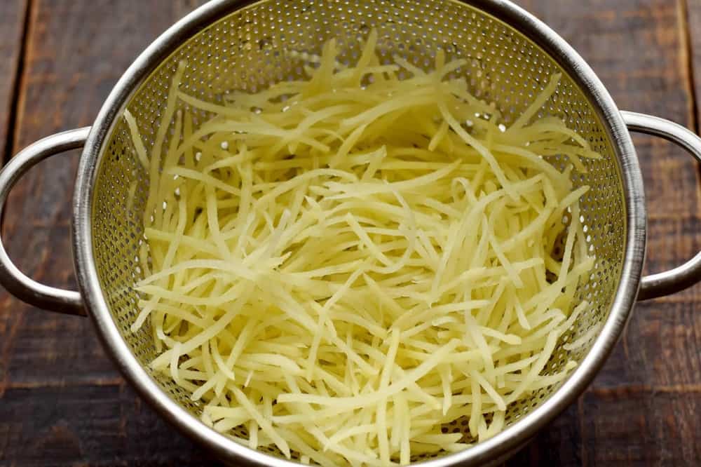 Насамперед приготуйте картоплю Пай. Для цього картоплю очистіть від шкірки, далі натріть на спеціальній тертці з насадкою «морква по-корейськи». Стружку замочіть на 5 хвилин у воді, щоб відійшов весь крохмаль, потім перекиньте картоплю на сито, промийте проточною водою 4-5 разів. Соломку викладіть на рушник, зверху накрийте другим рушником, картопля має стати сухою.